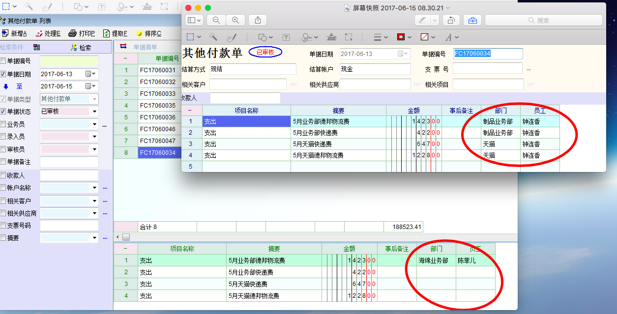 其他收、付款单设置了单据明细扩展,输入数据后,在F3单据清单中显示的明细扩展数据是错误的(如下图),一直显示的是第一次点击的单据的明细扩展