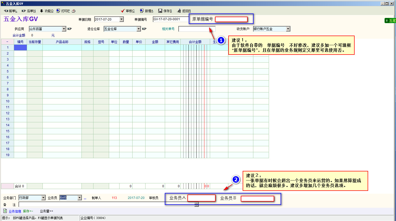 一张单据有时候会超出一个业务员来运营的。如果想算提成的话,就会麻烦很多。建议多增加几个业务员选项。