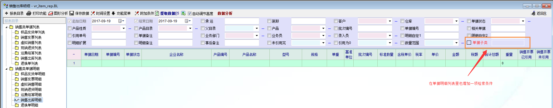 在进销存单据的统计报表中,单据列表里有“单据子类”检索条件,但是在单据明细列表里没有这个检索条件,希望能够增加这个检索条件。