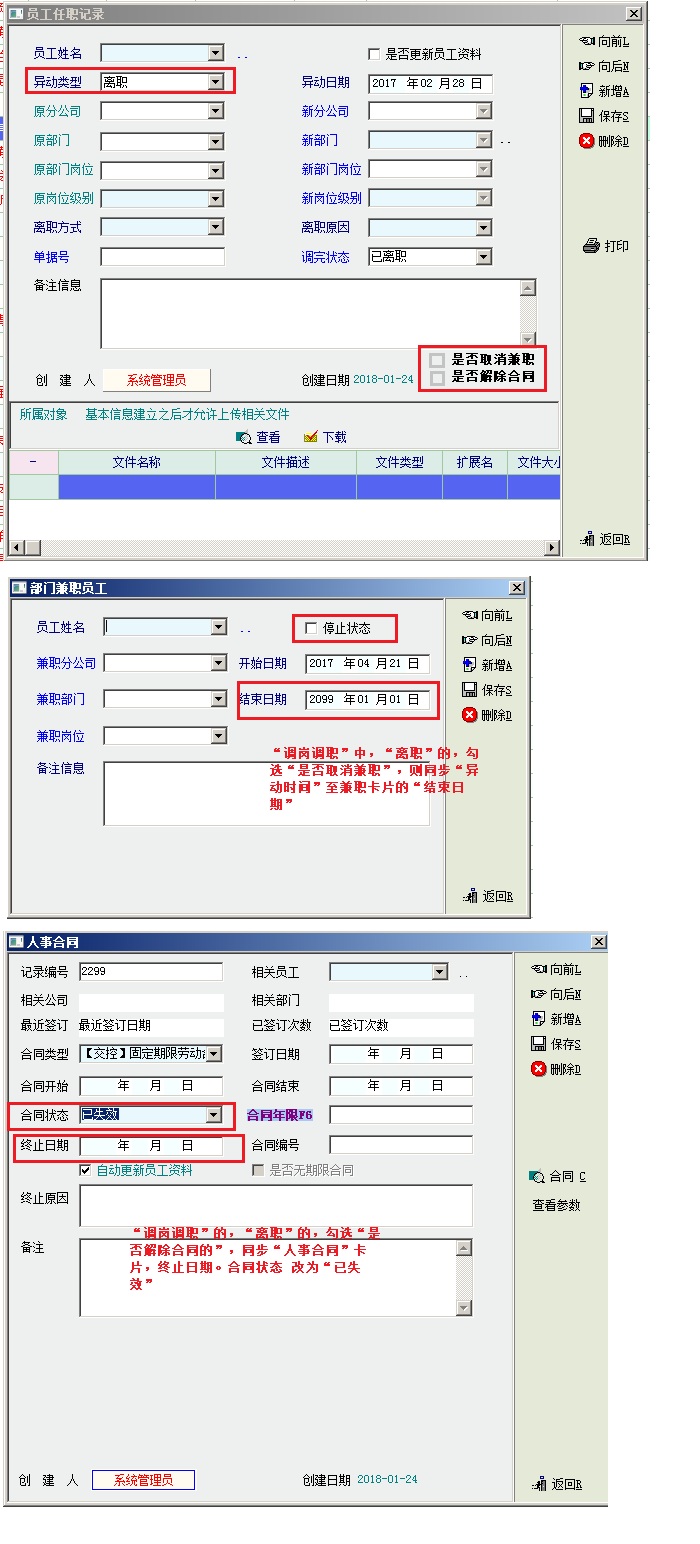 系统“调岗调职”模块做“离职”处理后,若该员工有兼职记录,应同步终止兼职、解除劳动合同。