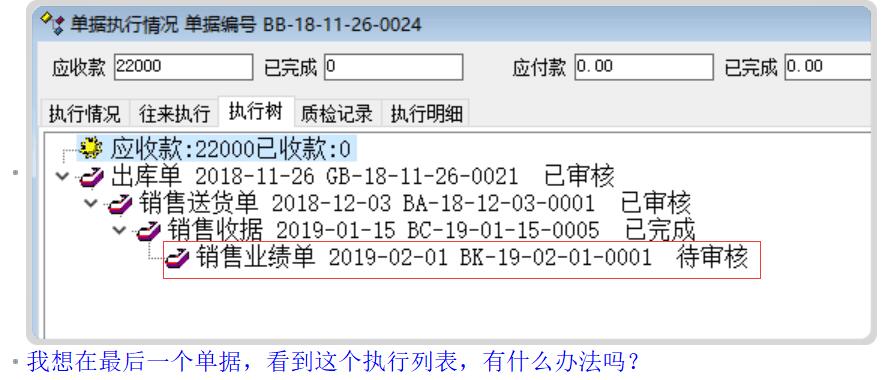 执行树在相关的所有单据里都显示全,方便末尾单反查数据。目前只能第一单能看全,实际上是末尾单需要返回去看收款情况等等!
