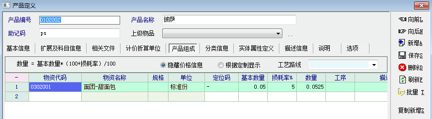 首先我在商品中将《披萨(成品)》的产品组成定义为《面团(半成品)》。将《面团》的产品组成定义为其它多种源材料,如图: