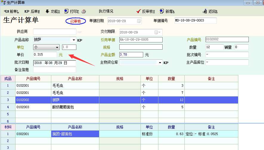 但是入库之后,只有《面团(半成品)》有价格,而《披萨(成品)》无价格:如下图: