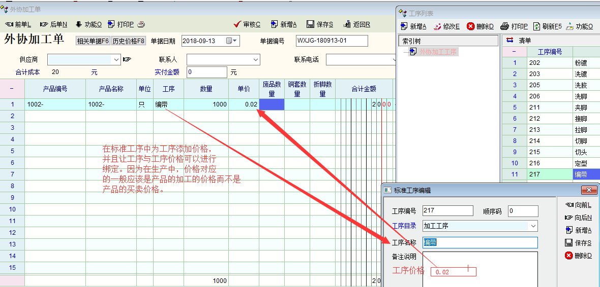 如图,建议为生产单元的物资单据的工序添加价格信息,类似计件工资计算中的工序科目一样。在生产环节中,我们有许多产品的加工工序是外发给供应商进行加工的,所以需要对加工工钱进行计算。目前的系统中加工单的价格只能与产品价格进行关联。产品价格与加工工序价格是完全不一样的,这样要对供应商的加工工钱进行计算就比较麻烦了。建议为生产单元的物资单据的工序添加价格信息,并让加工工序与工序价格可以进行绑定。