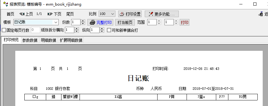 新版中帐簿查询中,不论是单科帐,还是序时帐,余额表,只要点击根据模板打印,顶栏就是乱码。试过作凭证报表中按模版打印就不出现这个问题,旧版的帐簿也不会出现这个问题。