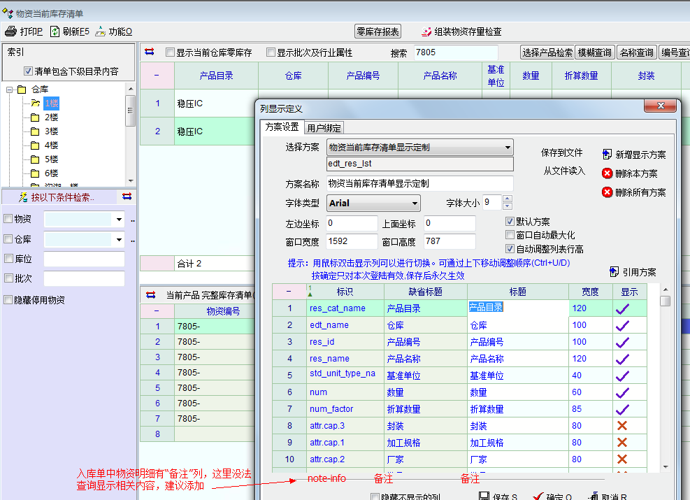 如图,当前产品 完整库存清单(不限定仓库)的列表中没法显示入库单明细物资的备注内容,建议在“显示定制”中添加此项内容。